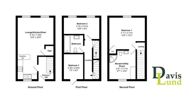 On the ground floor there is an entrance hall with stairs rising to the first floor, spacious living room with fireplace and electric fire, modern kitchen which is fitted with a range of stylish units and breakfast bar, plus a useful downstairs storage cupboard. To the first floor there is a good size double bedroom, further single room with Juliet balcony offering a lovely outlook over the courtyard and the house bathroom, which is part tiled and fitted with a modern white suite, including a bath with glazed screen and shower over. The top floor offers a further spacious double bedroom with skylight and a large versatile shower room, currently being used as a utility room also. The house is double glazed and gas central heating is in place.