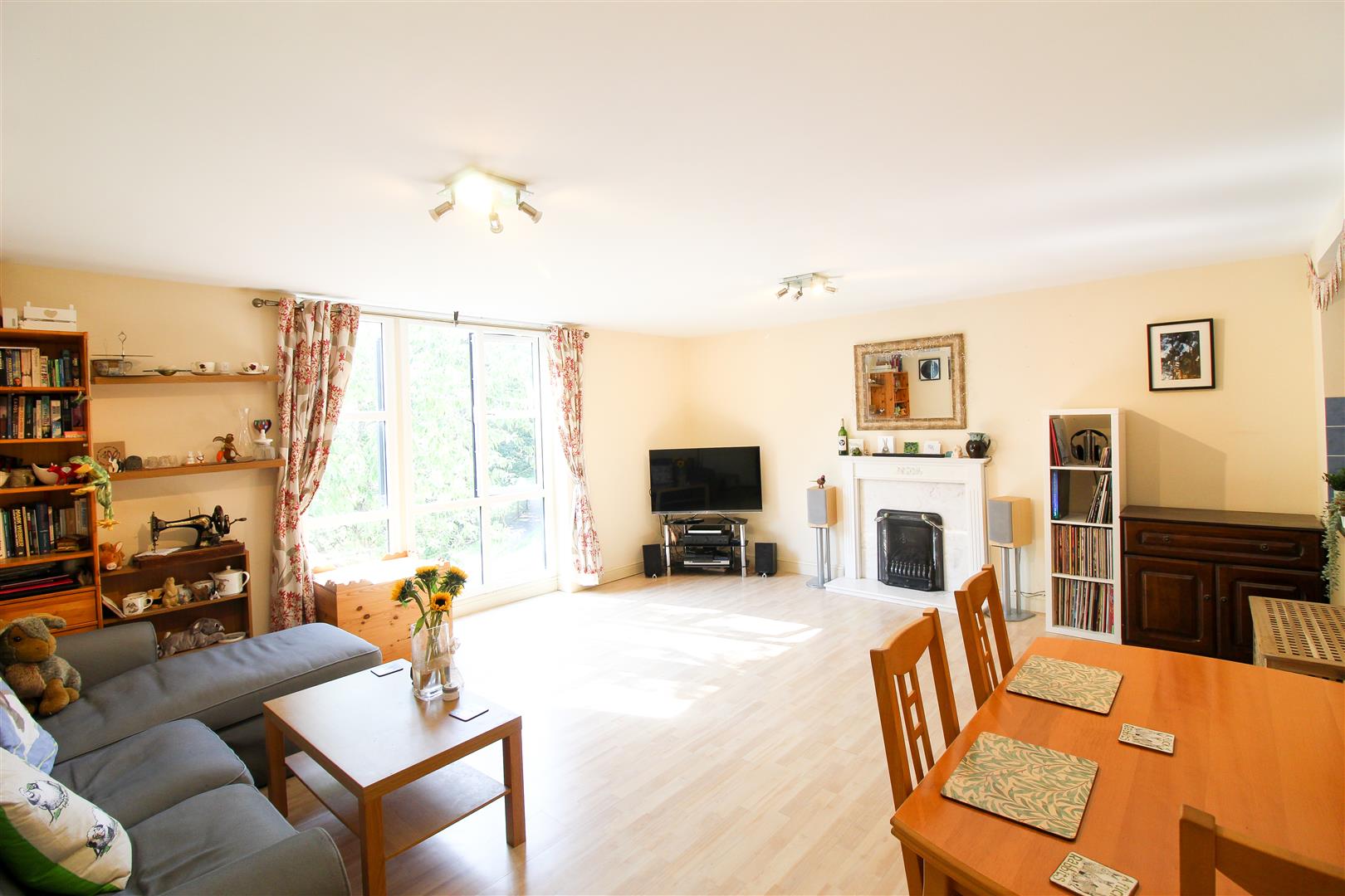 Internally the accommodation includes a private entrance hall with stairs to the upper floor and two handy storage cupboards, spacious open plan lounge/diner with a fireplace and a lovely open aspect over trees and parkland to the rear, plus a fitted kitchen with a range of units.