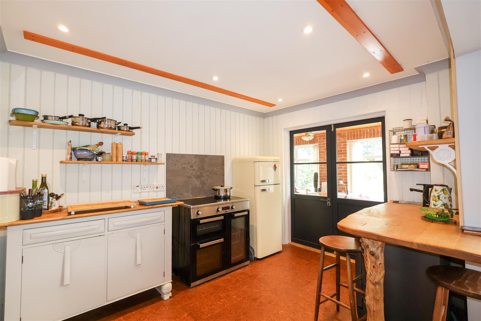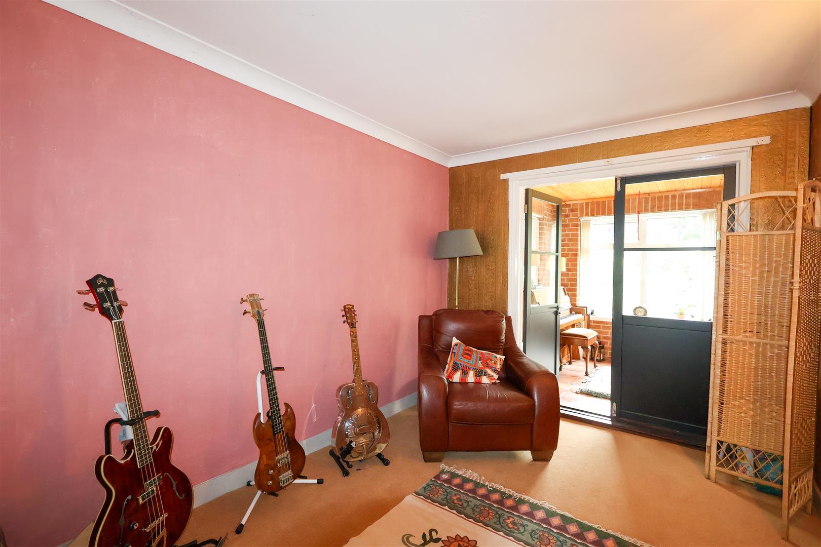On the ground floor the main entrance door leads into the spacious entrance hall, with stairs rising to the first floor. Wood flooring flows from the hallway, through double doors, into the good size living room, fitted with a stylish fireplace and multifuel stove. The living space leads open plan into the dining room and through double doors into the solid roof garden room, a lovely light and airy space, with a triple aspect, tiled floor and side access door. Glazed double doors leads to the breakfast kitchen, which has also undergone a revamp and comes fitted with a range of units and breakfast bar. There is an understairs cupboard and access to the single garage. To the first floor there is a landing with loft access and airing cupboard, four bedrooms (two with fitted storage) and the house bathroom, which comes part tiled and fitted with a modern white suite. The house is double glazed and electric heating is in place.