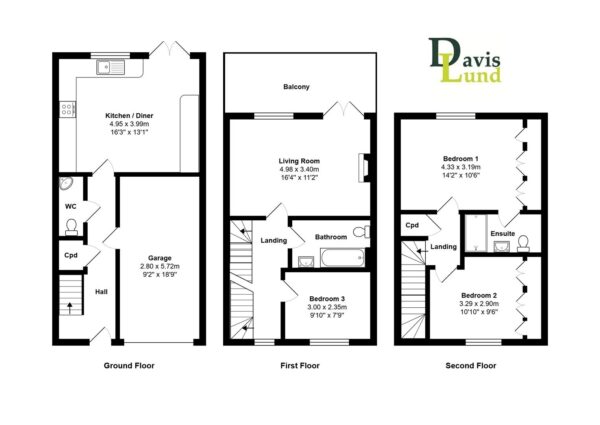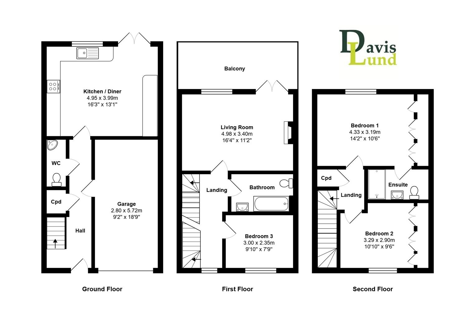 On the ground floor there is a spacious entrance hall, with a cloakroom/WC and access to the integral garage. A large open plan kitchen/diner completes the downstairs layout, fitted with an extensive range of stylish units and integrated appliances, whilst there is space for a dining table and double doors lead to the rear garden. To the first floor there is a landing, living room with double doors onto the balcony which enjoys wonderful views, the third bedroom and the house bathroom, which is fully tiled and fitted with a modern white suite. On the top floor there is a further landing with airing cupboard, the main bedroom with a range of fitted wardrobes and ensuite shower room, plus the second bedroom.