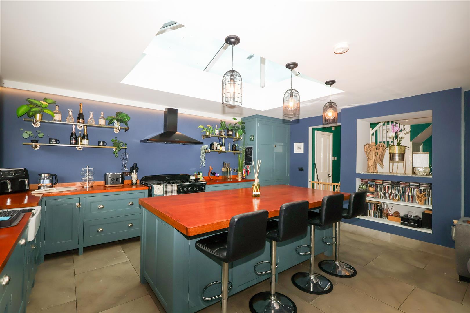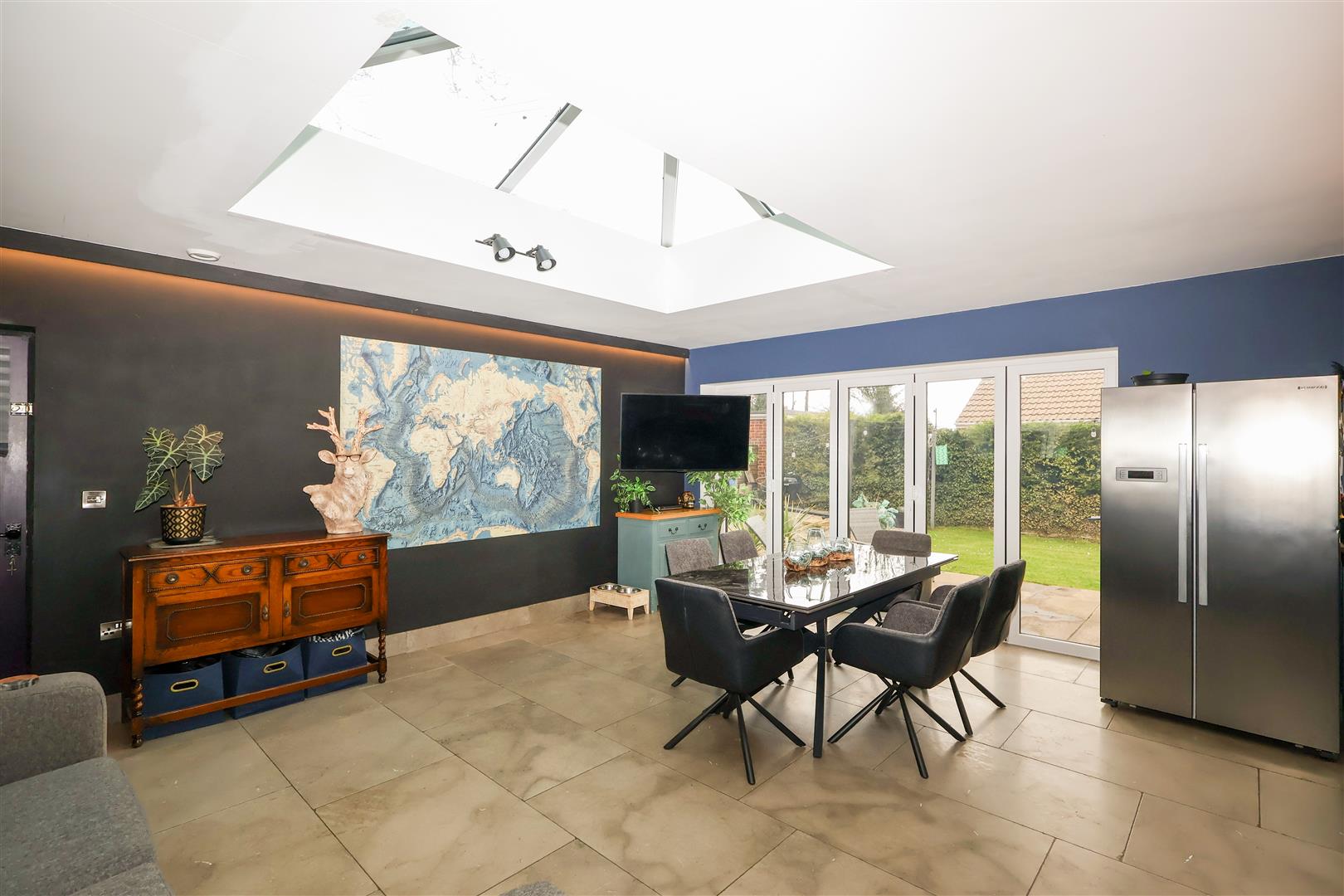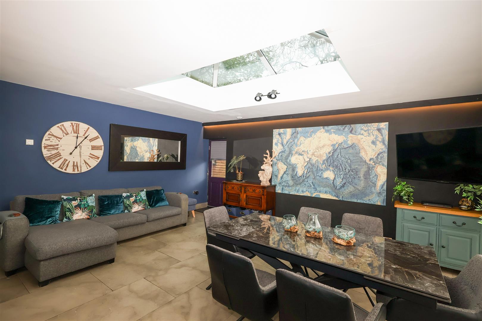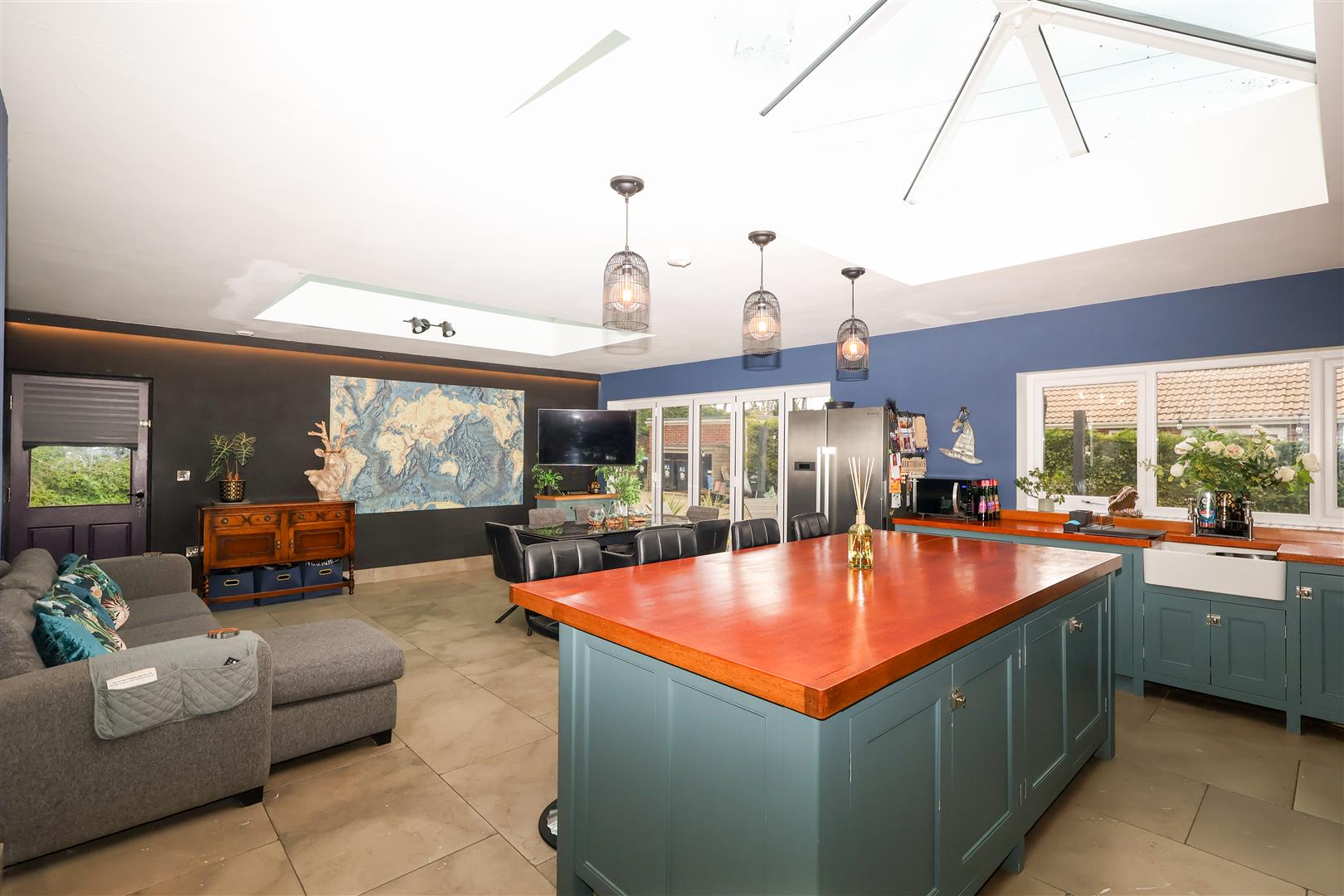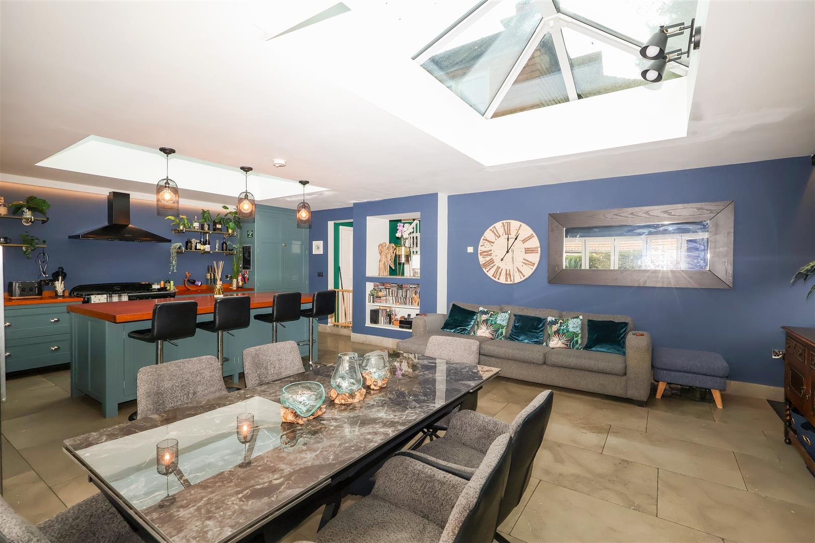 On entering the property, there is an entrance hall, leading to the spacious double aspect living room. Currently utilised as a home gym, the living room is a versatile space with fitted alcove storage. From the living room, there is a spacious utility/cloakroom, with stairs rising to the first floor and a downstairs shower room. The kitchen/diner/family room is a generous size with bi-fold doors opening onto the garden, underfloor heating and a large decked area, great for entertaining. The kitchen is fitted with a range of stylish units, some integrated appliances, modern overhead lighting and a breakfast bar/island creating a great space for indoor dining. A true hub of the home, the family room has ample space for a large dining table and lounge area, with large skylights filling the room with natural light. There are two well-proportioned double bedrooms, one currently utilised as a walk-in wardrobe/dressing room. Upstairs, there is a landing, two further double bedrooms with skylights and the house bathroom. The bathroom is part tiled and fitted with a white suite, including a bath with handheld shower and heated towel rail. The property also benefits from double glazing throughout and gas central heating.