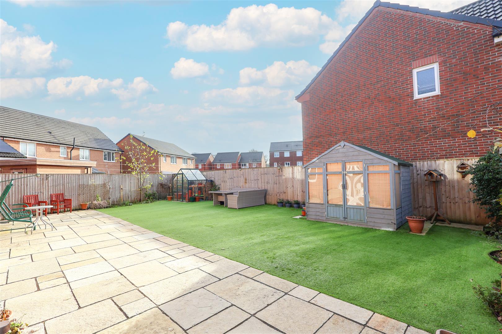 Externally, there is an open lawned garden to the front of the house, with a mature hedge border, whilst a block paved driveway provides parking and access to the garage. Gated access is available to the lovely established enclosed rear garden, mostly laid with artificial turf for ease of maintenance, whilst there is also an extensive patio seating area perfect for outdoor entertaining and a shed for handy storage. There is access to the front of the property together with useful additional outdoor storage space on one side of the house, whilst the other side of the property offers even more additional storage space. There is also an electric car charger.