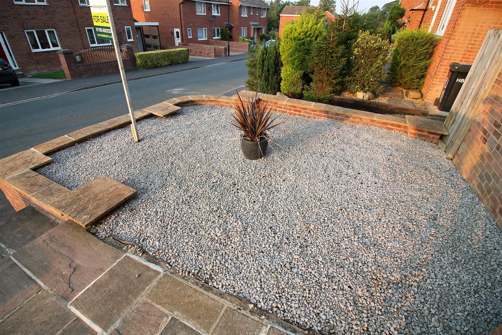 To the front of the property there is a raised graveled garden, with steps leading to the front door.