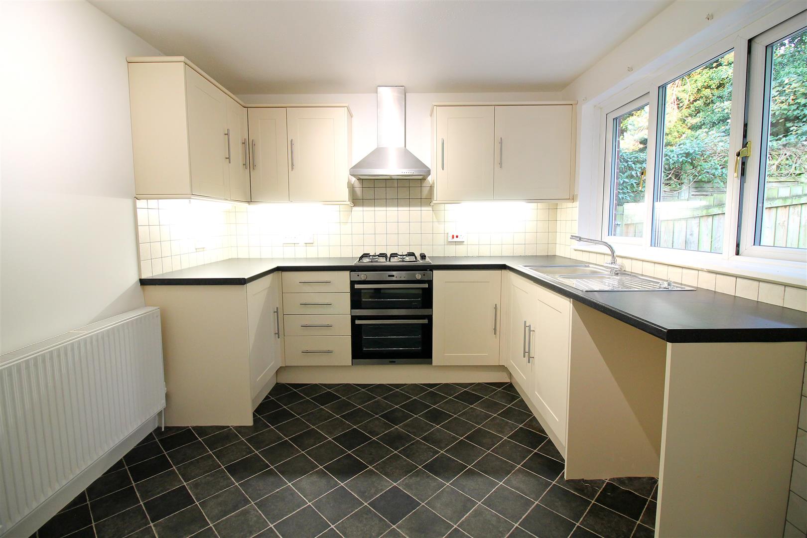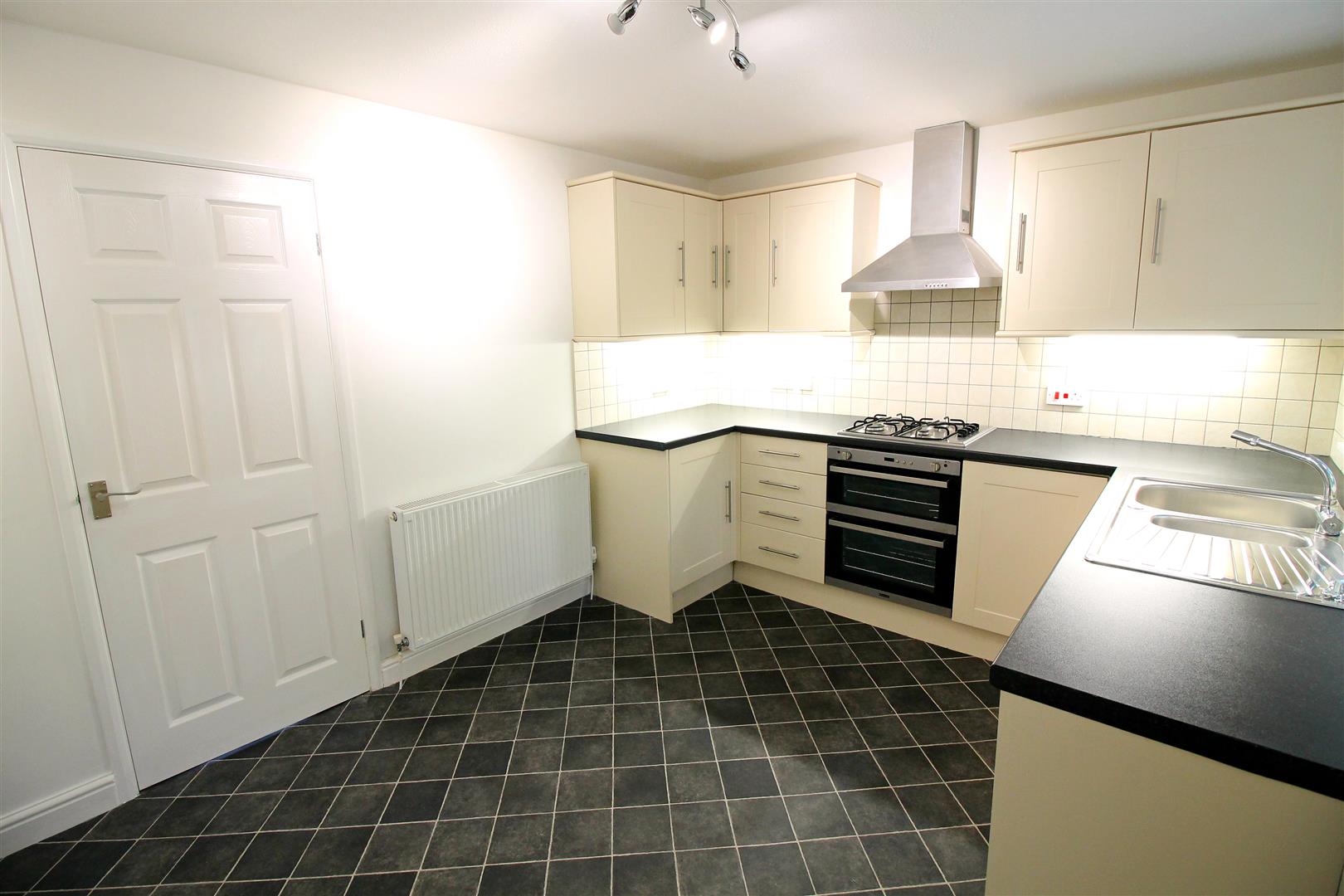 A spacious kitchen/diner fitted with a range of modern wall and base units with contrasting rolled edge work surfaces and tiled splashbacks, stainless steel electric oven with four ring gas hob and stainless steel extractor hood over, space and plumbing for washing machine, stainless steel sink with mixer tap, wall mounted Worcester combination boiler, double glazed window to rear and half glazed door leading to the rear garden.