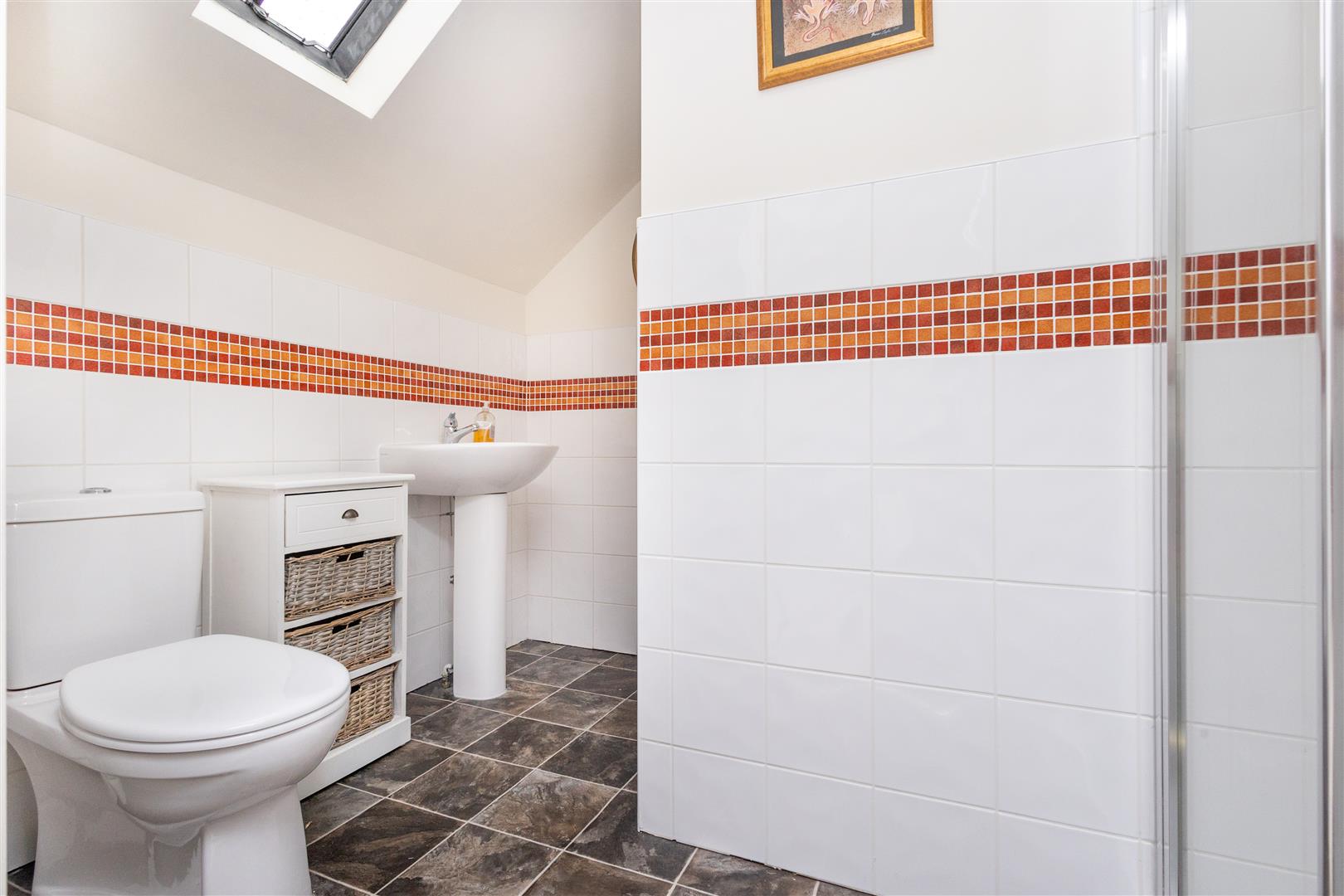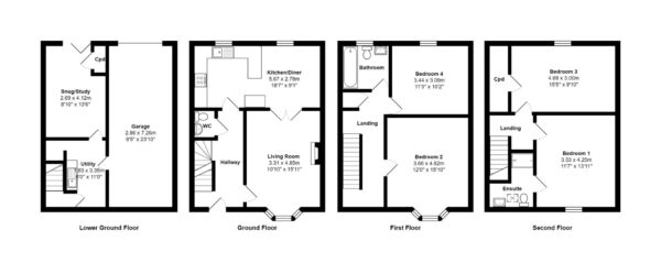 To the ground floor there is an entrance hall with cloakroom/WC, living room with large bay window and double doors leading to the open plan kitchen/diner, fitted with a range of modern units and integrated appliances. Stairs lead down to the lower ground floor, where there is a utility room, study/snug with bi-fold doors and the large garage, which runs the full depth of the house. To the first floor there is a landing with storage cupboard, two double bedrooms and the house bathroom, part tiled and fitted with a white suite, including a bath with glazed screen and shower over. On the top floor there is a landing and two further good size double bedrooms, one with ensuite facilities and the other with a large storage cupboard.