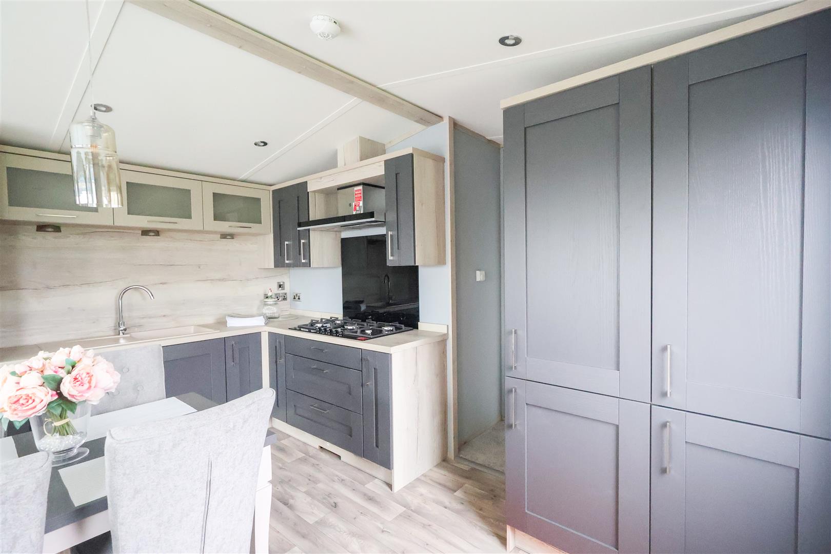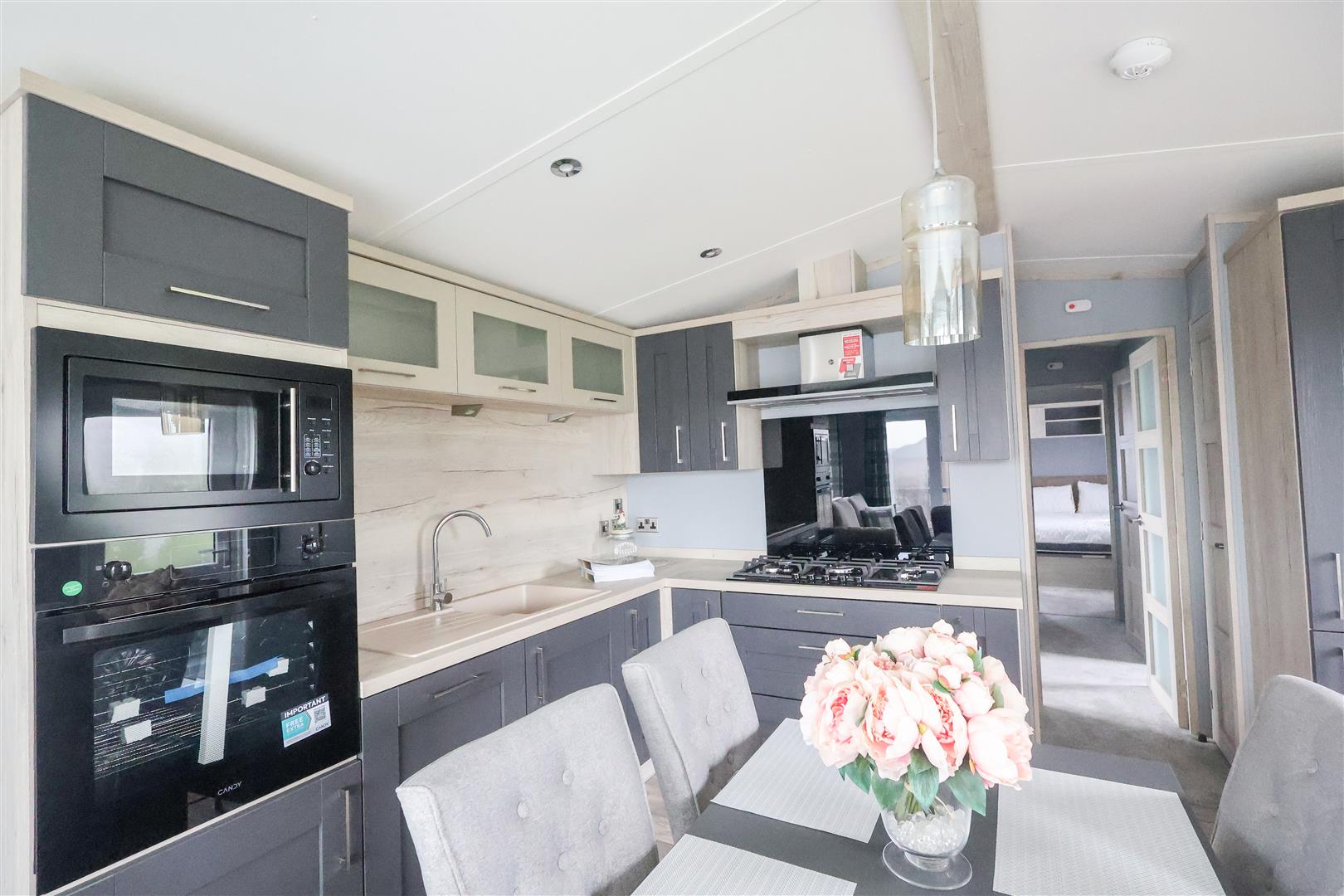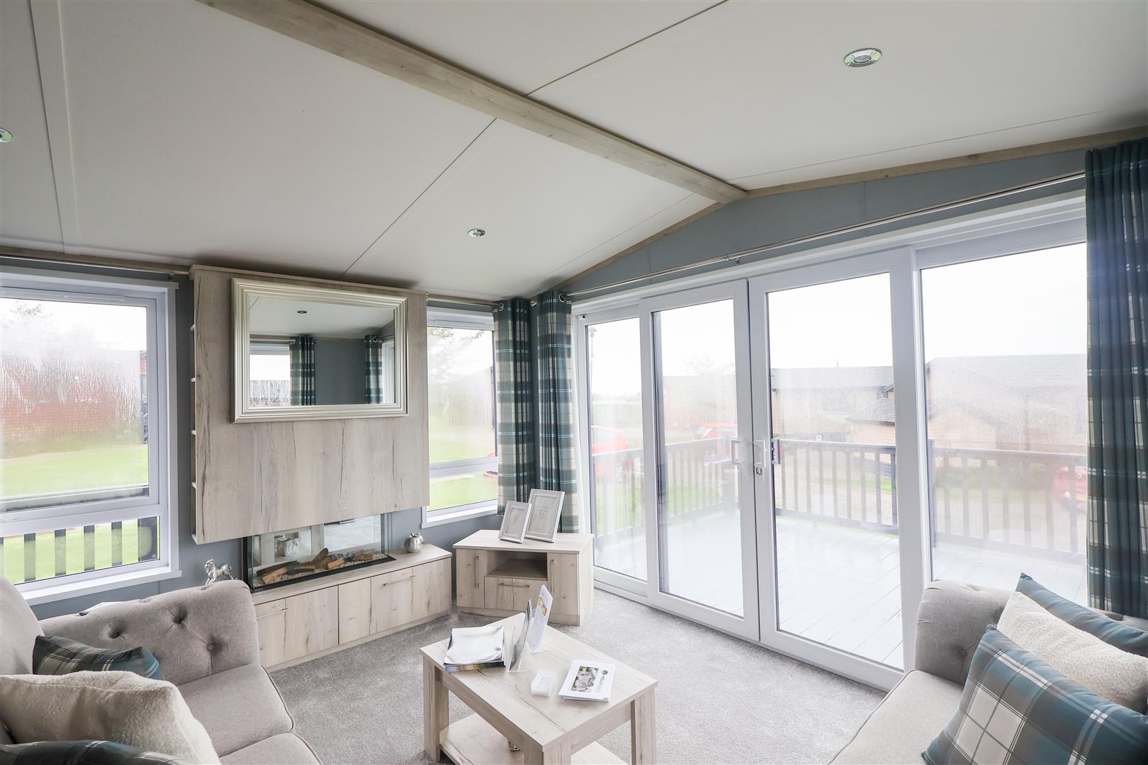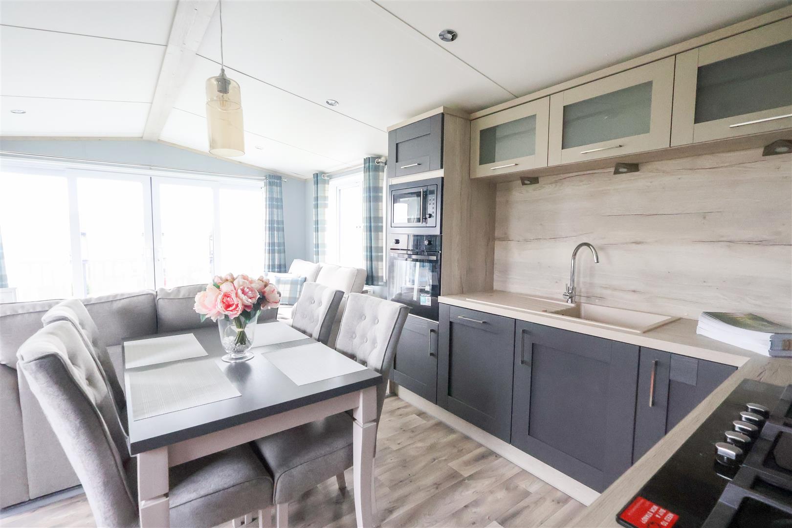 Internally, the lodge offers a large open plan living and dining space, plus a stylish fitted kitchen, coming fully equipped with a range of integrated appliances. Through the inner hallway, there is main bedroom with fitted wardrobes and ensuite shower room, second twin bedroom with fitted storage, stylish shower room with a white suite and separate utility room.