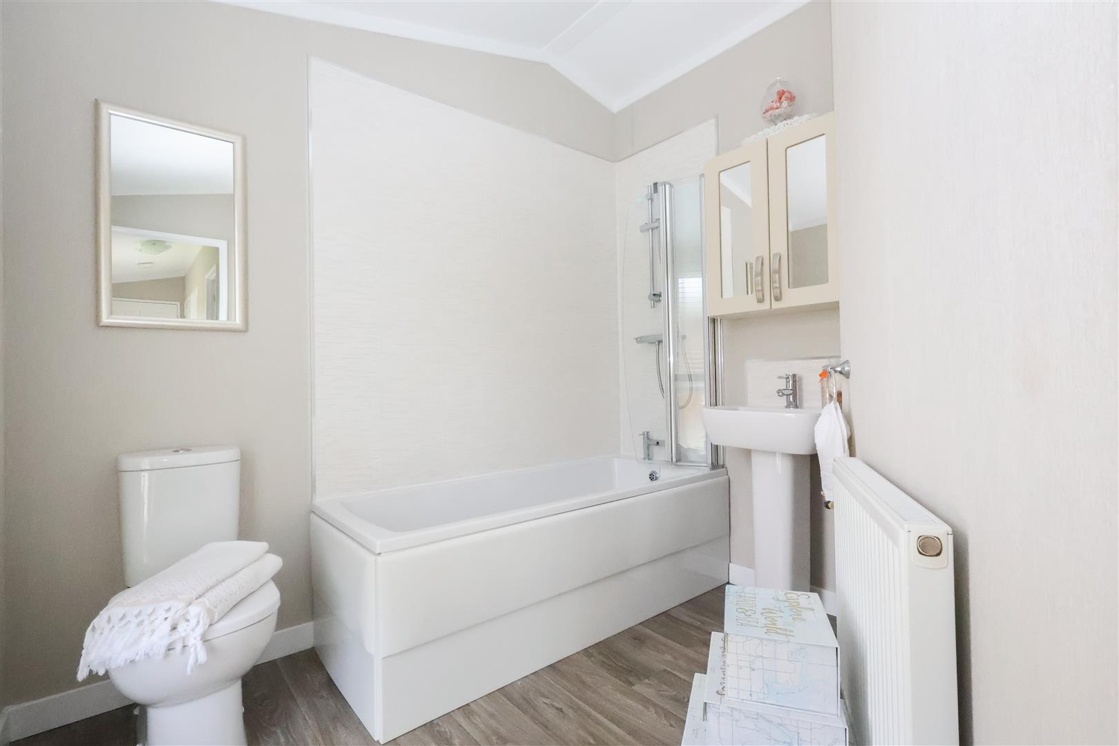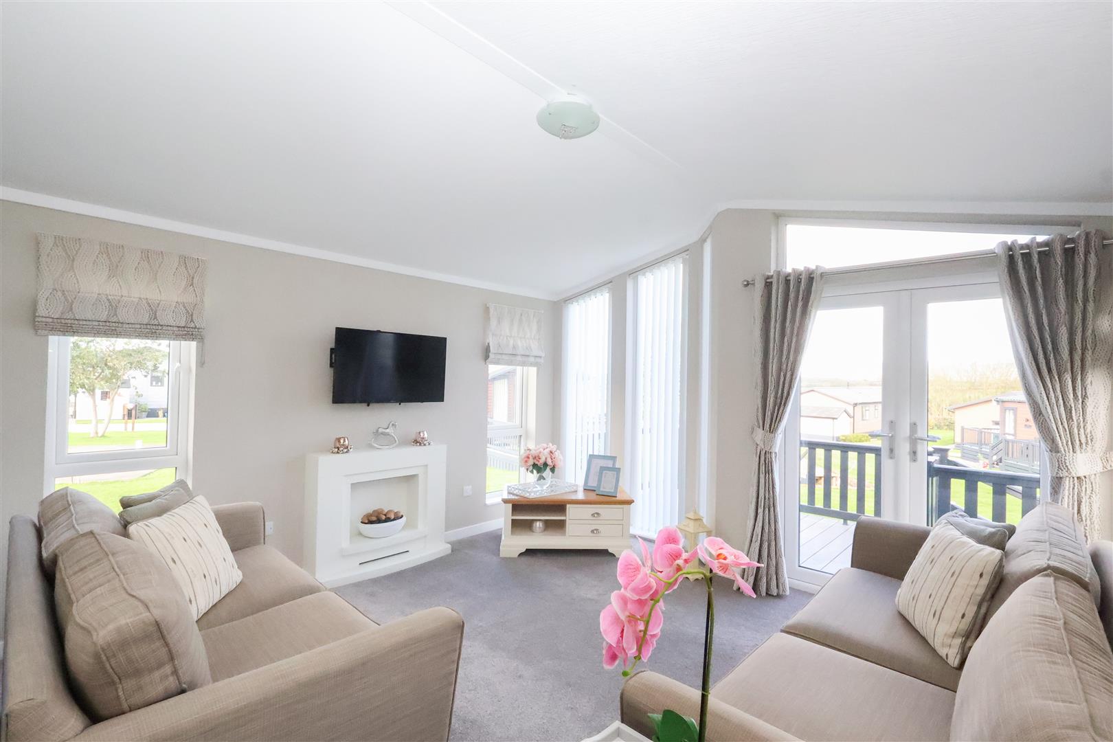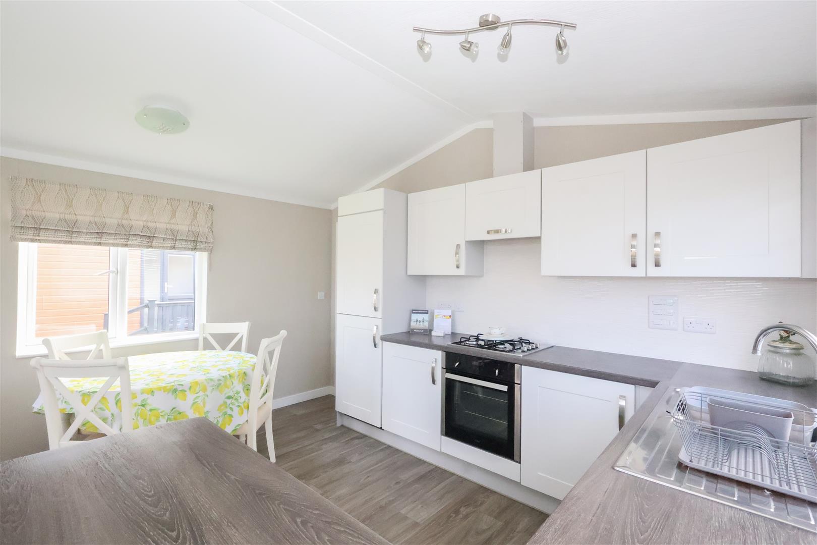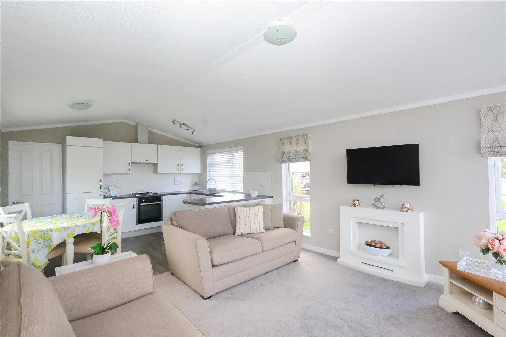 Internally the lodge offers a large open plan living space, with living and dining areas, plus a stylish fitted kitchen, coming fully equipped with a range of integrated appliances. There is an inner hallway, main bedroom with walk in wardrobe, second bedroom, plus the stylish bathroom, fitted with a modern white suite incorporating a bath with shower over and vanity basin.