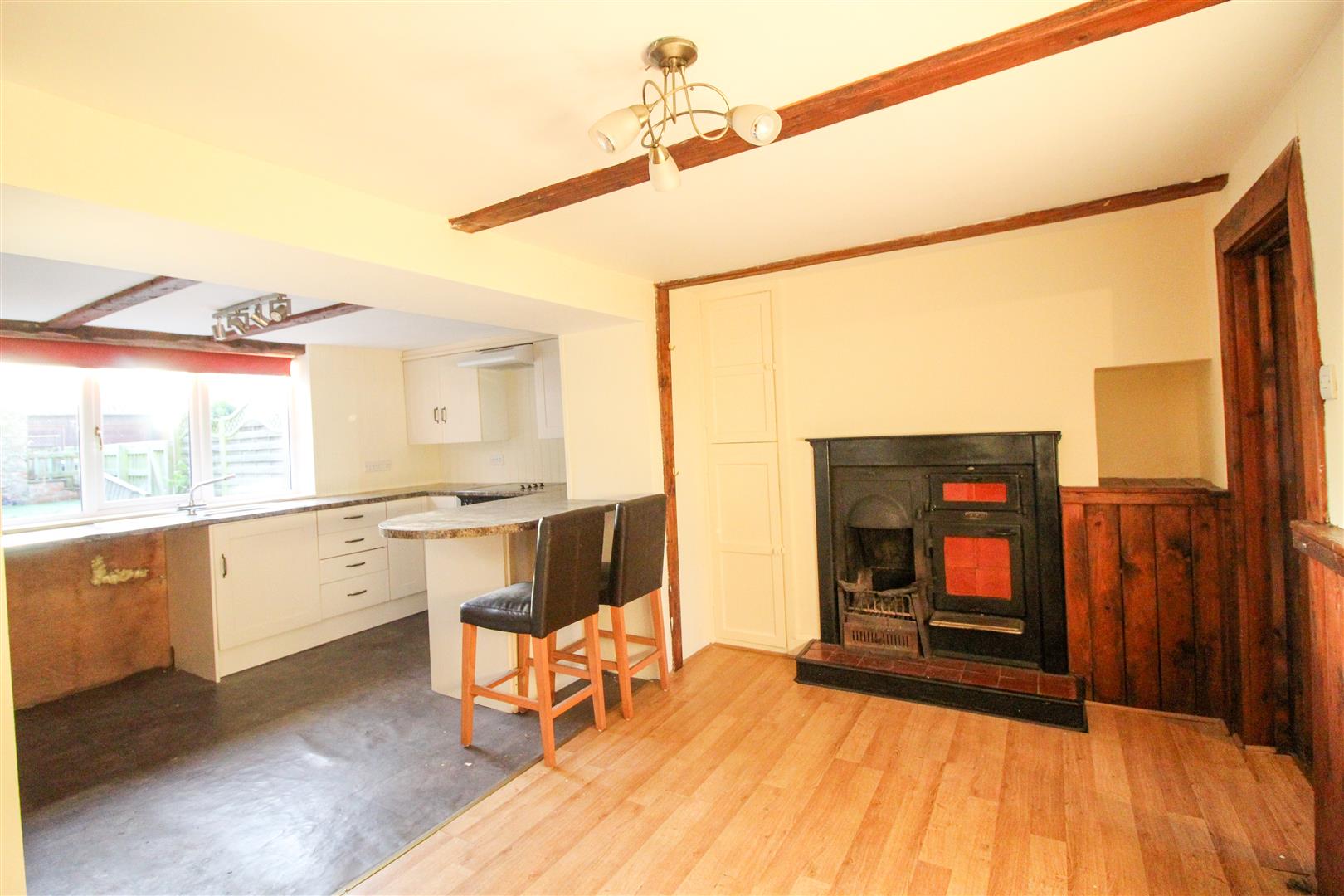 The property compromises of a cosy living room with a coal fire, kitchen dining area, which is fitted with modern units including an integrated oven, hob and extraction fan.